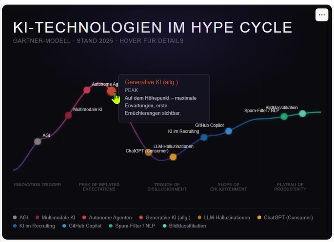 Im angehängten Video siehst du das Ergebnis: eine interaktive Infografik zu KI-Technologien im Hype Cycle. Mit interaktiven Elementen, Einordnung der Phasen gebaut von Claude, ohne eine Zeile Code von meiner Seite. In 2 Minuten.